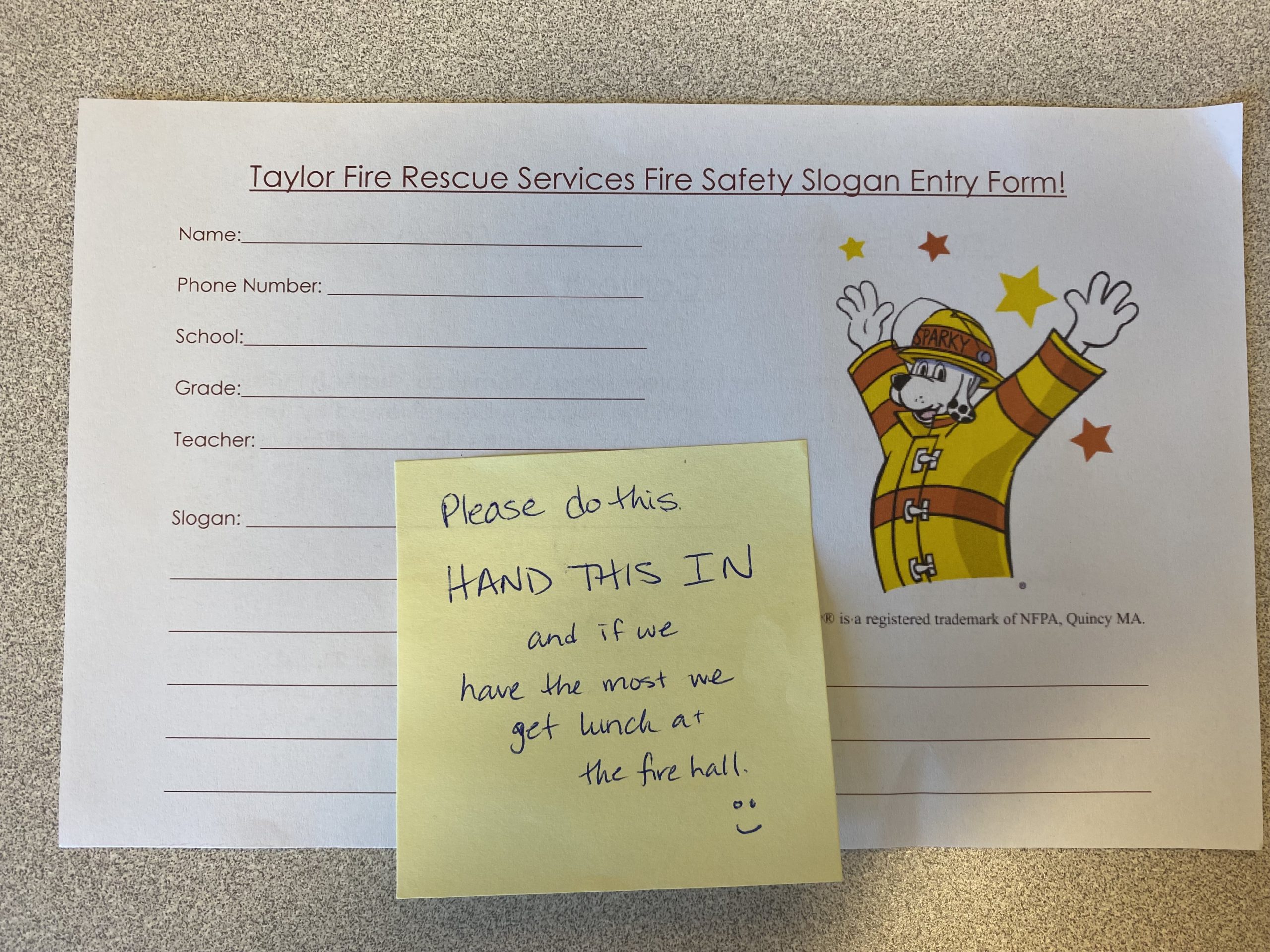 Thanks to the Taylor Fire Department for their visit today! Thanks to all the students and staff for a great fire drill. The Taylor Fire Department provided each student with a Fire Prevention bag. Check it out for some contests and important fire prevention information.